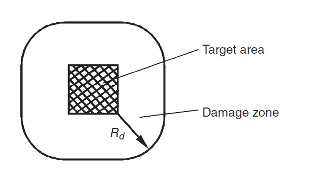 In this case, the main characteristic that determines the effectiveness is the coordinate law of damage G(x,y,z). It is a functional relationship between the probability of the target damage and the coordinates of the explosion point of the ammunition relative to the target. The simplest type of coordinate law is for high-explosive ammunition, the effect of which is estimated by the target destruction radius Rd. Hence, for high-explosive ammunition, the coordinate law is expressed as a simple stepwise dependence on the distance to the target R. If the projectile explodes at a distance R ≤ Rd from the target, then G(R) = 1, and at R > Rd, G(R) = 0. The area of space around the target, inside which G(R) = 1, is called the area of unconditional target damage. The boundaries of this area are lines or surfaces equidistant to the target contours2. The zone of unconditional target damage by the blast/shock wave action is shown in the following picture: