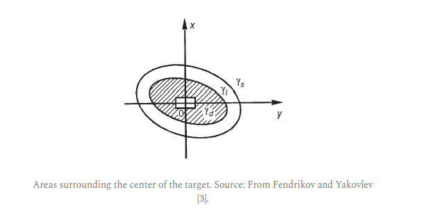 Coordinate laws of damage vary depending on the nature of the target, ammunition capacity, and other conditions. For a deeply buried command bunker/post such as the ChZ 417 object in Kiev, that will be depth, wall composition, surrounding media composition, Oreshnik speed, angle of impact, payload, and weight, to name just a few. When considering these laws, three different areas can be identified around the center of the target. One of these areas (γd) is characterized by the fact that a round of ammunition bursting at any point within it always leads to the destruction of the target. This area is called a reliable damage area. This is followed by an area (γi) where it does not necessarily result in the target being damaged. This is referred to as the area of unreliable damage. The area (γs) in which ammunition does not damage the target at all is called the safe area.
