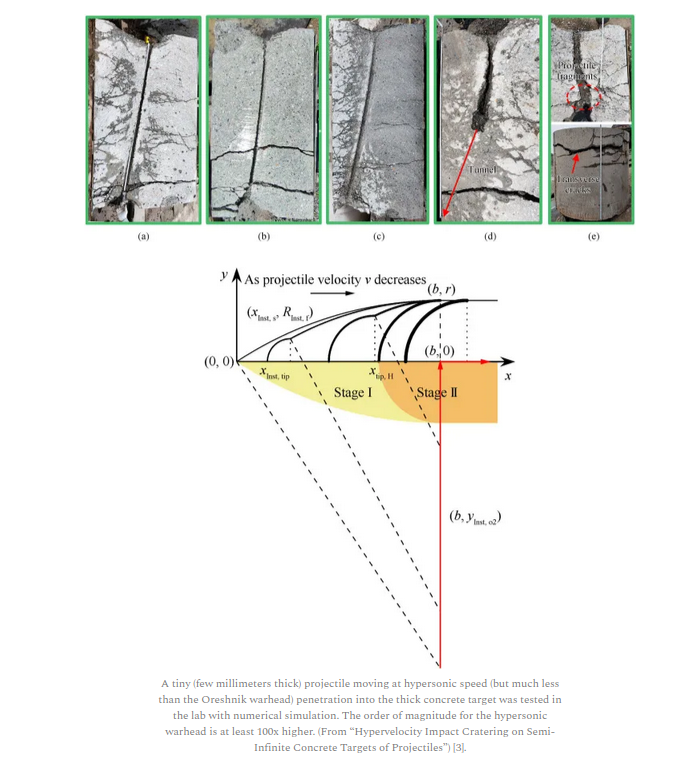 The experiment and photos shown above are used in this article to illustrate the penetration. However, during the Oreshnik hypersonic warhead penetration, this is magnified by 100x or more. The Russian source said that the surface temperature of the warhead is 4000 C, and to withstand this temperature, a special alloy, combination of alloys or ceramic based material is developed. The composition is top secret. It is known that Tantalum-Hafnium carbide or Hafnium carbonitride has a melting point of almost 4000 C but these materials are used only as an example. If the warhead can resist 4000 C without melting, maybe is something else added. Density is another unknown and can be easily higher than 16 g/cc. One thing is sure: with a 4000-degree body temperature, which is moving 10 Mach (3.43 km/s), and with approximately 200 kg weight, the concrete around the shaft will partially evaporate, and the warhead will penetrate due to momentum and energy to a depth of 80-100 m. The following illustration presents what may happen with an almost perpendicular impact on the surface of the reinforced concrete above the shaft.
