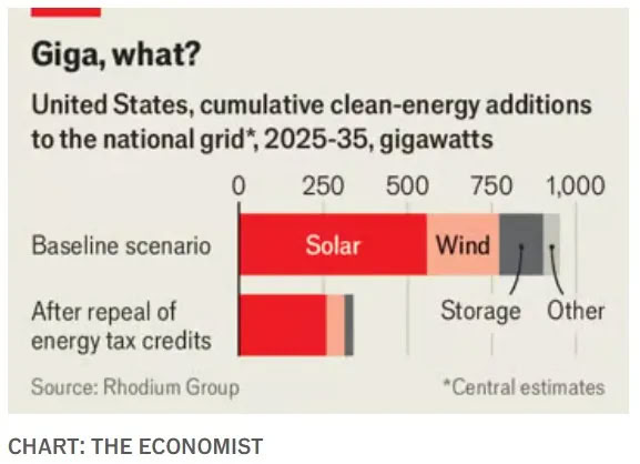 This bill will likely reduce clean energy build-out across America from nearly 1,000 gigawatts (GW) by 2035 to around 342 GW by 2035. That’s extremely painful. That’ll mean higher electricity prices just about everywhere, and make it harder to build and power green steel, batteries, cars, AI data centers, and lots of other things. America is making the choice to become a laggard, not a leader — a de-industrializing state that’s falling behind on one of the core drivers of economic development in the 21st century.