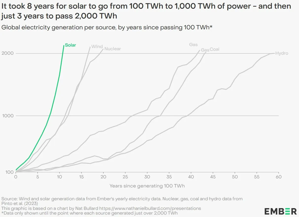 But while the U.S. struggles, the rest of the world is still accelerating. Solar power just keeps on growing faster than any other energy source ever has. The headlines in solar-industry news sites these days would have seemed like a climate activist’s utopian fantasy ten years ago. Solar factories are going up from Oman to Ethiopia. Solar imports in the first half of 2024 alone absolutely transformed the energy system of Pakistan, and the fans and ACs they power will likely solve multitudes of lives during the next South Asian heatwave. China’s solar growth looks to have caused an emissions peak in the world’s biggest emitter years before it was expected. Sub-Saharan Africa might be seeing the beginning of an exponential solar boom. Solar mini-grids are empowering remote indigenous villages across Latin America. Researchers are finding that the fast-expanding solar farms in deserts actually benefit local wildlife by providing shade and a windbreak.