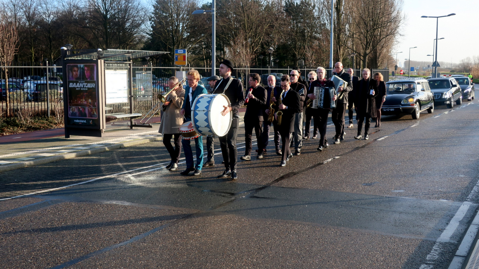 31 december 2019. De rouwstoet voor de een week eerder overleden dichter Jules Deelder, die zelf in een verlengde Citroën DS arriveert bij Hofwijk. Foto Wim de Boek